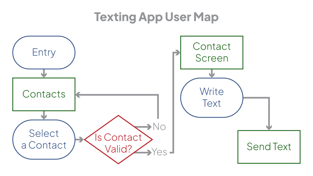 Diamonds are where the map will split into a different path, depending on how the question is answered. In the texting app, the map would start at “entry”, then a “contacts” screen would be added, with an arrow between showing the user’s direction. “Select a contact” would then follow, in a circle.